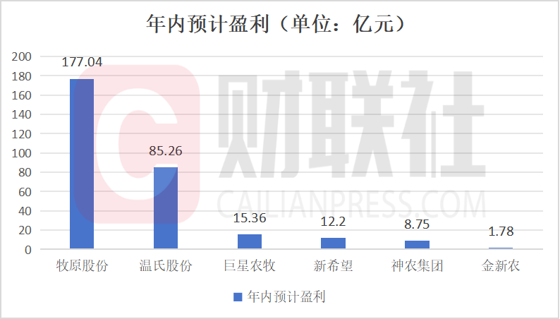 據此類推,巨星農牧(603477.SH)、神農集團(605296.SH)、新希望(000876.SZ)、金新農(002548.SZ)和溫氏股份等今年或有望分別盈利不低于15億元、8億元、12億元、1億元和85億元。