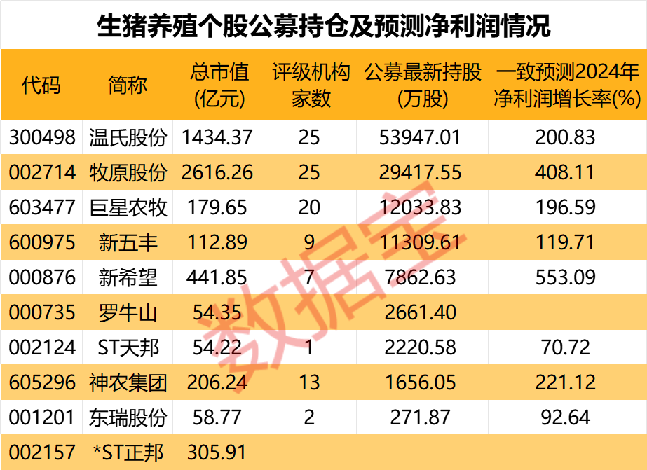 從機構持倉角度看,溫氏股份、牧原股份、巨星農牧、新五豐公募基金一季度持股量居前,依次為5.39億股、2.94億股、1.2億股、1.13億股,另有多股持股量逾1000萬股,僅*ST正邦未被公募基金持有。*ST正邦自6月12日開市起撤銷退市風險警示,股票簡稱變更為“正邦科技”,股票交易價格的日漲跌幅限制由5%變更為10%。