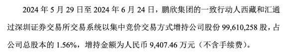 據披露,鵬欣集團的一致行動人西藏和匯以集中競價方式累計增持公司股份9961萬股,占已發行總股本的1.56%,增持金額為9407.46萬元。