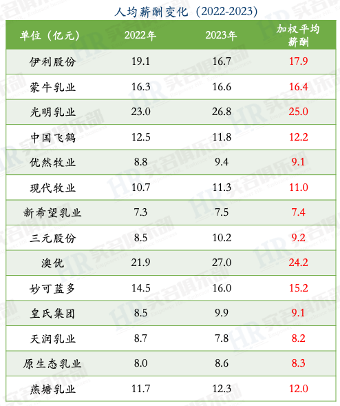 兩年加權計算,最高為澳優和光明乳業加權平均薪酬為24~25萬元,其次是伊利股份和蒙牛乳業為16~18萬元。