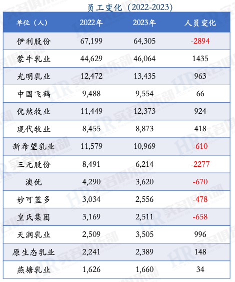 2023年,伊利股份和三元股份減員最多,減員超2000人。人員同比減少的還有新希望乳業、澳優、妙可藍多、皇氏集團4家企業。考慮人員正常流失,中國飛鶴和燕塘乳業也明顯在降本控編。