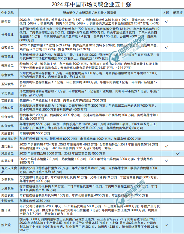 2024年中國肉鴨企業50強:新希望、桂柳牧業、益客食品位列前三