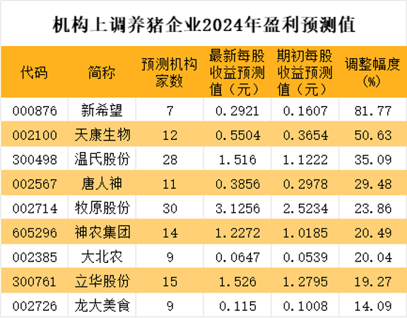 在豬肉價格走高的背景下,機構紛紛上調養豬企業的盈利預測。天康生物每股盈利預測從0.36元上調至0.55元,上調幅度達到50.63%;溫氏股份、唐人神、牧原股份、神農集團的盈利預測均被上調超20%。