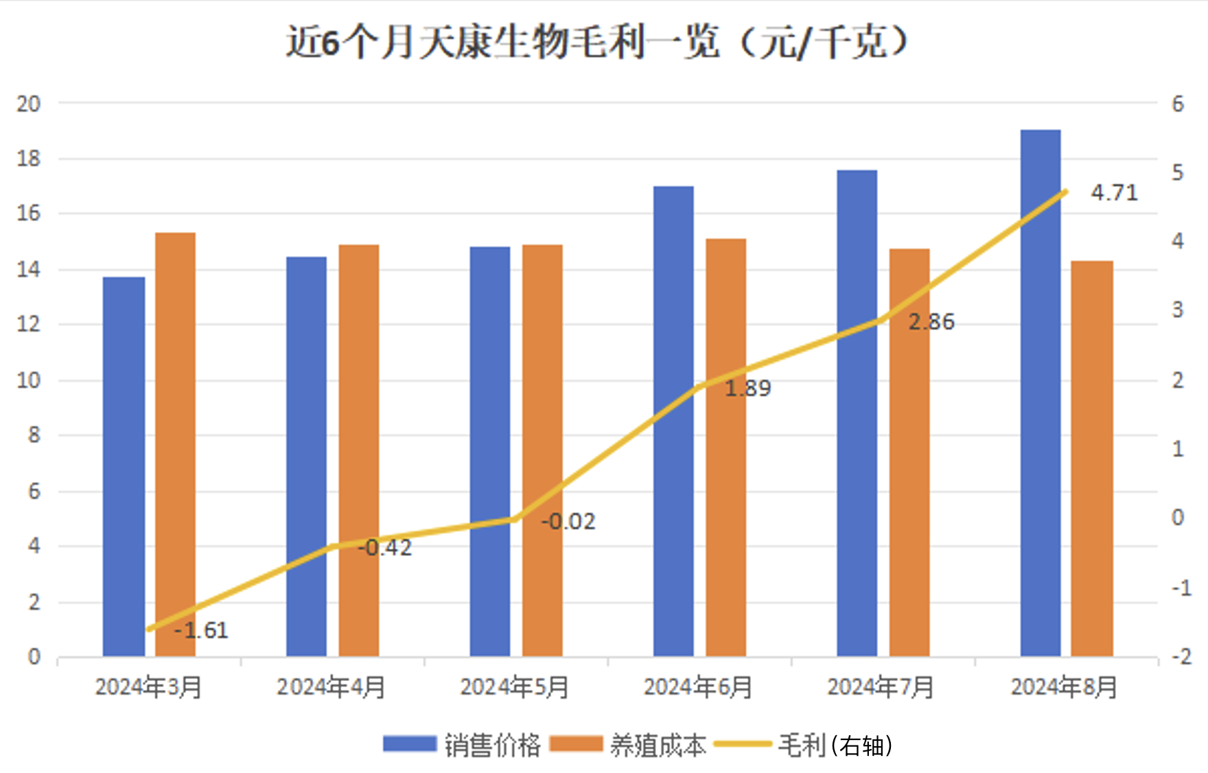 對比天康生物的銷售價格和養殖成本,今年3月每公斤生豬仍虧損1.61元,到5月份基本盈虧平衡,6月每公斤生豬盈利1.89元,7月盈利2.86元,8月盈利4.71元??梢悦黠@的看出,天康生物近3個月單位生豬的盈利能力在快速提高。