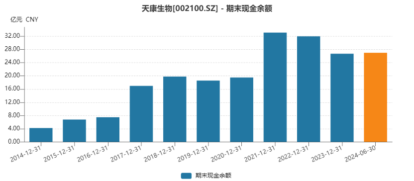 公司在手的現金也非常雄厚,2022年末現金及等價物余額為32億元,2023年末為26.73億元,今年上半年末為27.03億元。近幾年在手的現金均為歷年來高位,雄厚的現金基礎,保障了天康生物較強的抗風險能力,助力公司穿越豬周期。