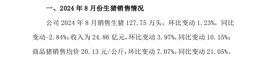 新希望日前發布的數據顯示,8月份,公司銷售生豬127.75萬頭,同比減少2.8%。1-8月,公司累計銷售生豬1122.81萬頭,同比減少了3.9%。