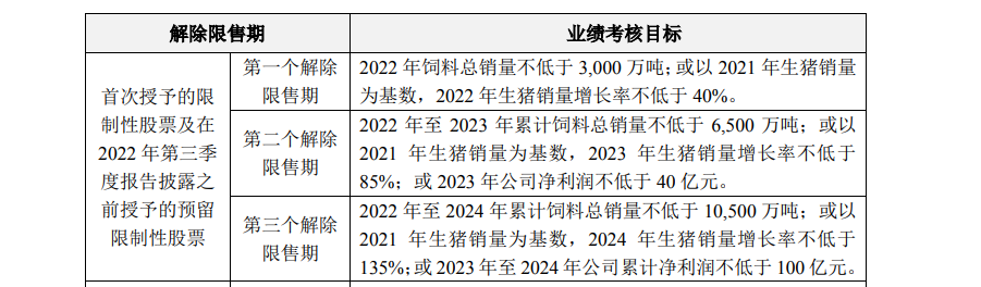 《財中社》注意到,在具體業績要求上為2022年、2022年-2023年和2022-2024年飼料總銷量不低于 3000萬噸、6500萬噸和1.05億噸;或以2021年生豬銷量為基數,2022-2024年生豬銷量增長率不低于40%、85%和135%。