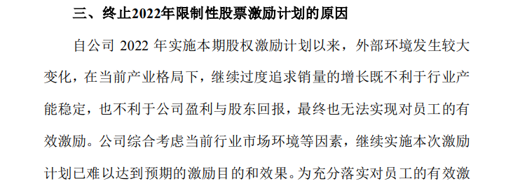 新希望公告表示,自實施2022年股權激勵和員工持股計劃以來,外部環境發生較大變化,在當前產業格局下,繼續過度追求銷量的增長既不利于行業產能穩定,也不利于公司盈利與股東回報,最終也無法實現對員工的有效激勵。