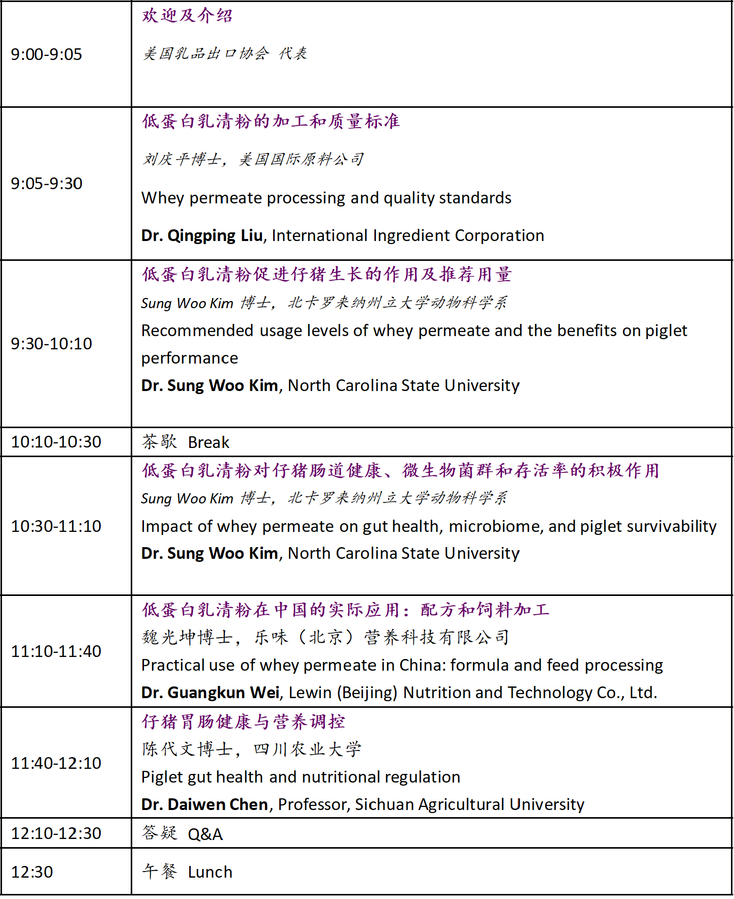 過去幾年來,我國生豬產業發生了深刻而巨大的變化。目前,生豬養殖行業正在從本輪周期底部逐漸恢復,市場信心顯著增強。值此之際,美國乳品出口協會將于2024年10月25日上午舉辦專場飼料技術研討會。此次研討會將邀請數位知名專家,聚焦低蛋白乳清粉在促進仔豬健康生長和提高生產性能中所能發揮的益處,與業內朋友充分交流分享。美國乳品出口協會誠邀您參加此次飼料技術研討會,與發言嘉賓以及美國乳原料生產企業代表深入探討,通過在仔豬飼料中科學使用美國低蛋白乳清粉,大幅提升養殖的經濟效益。