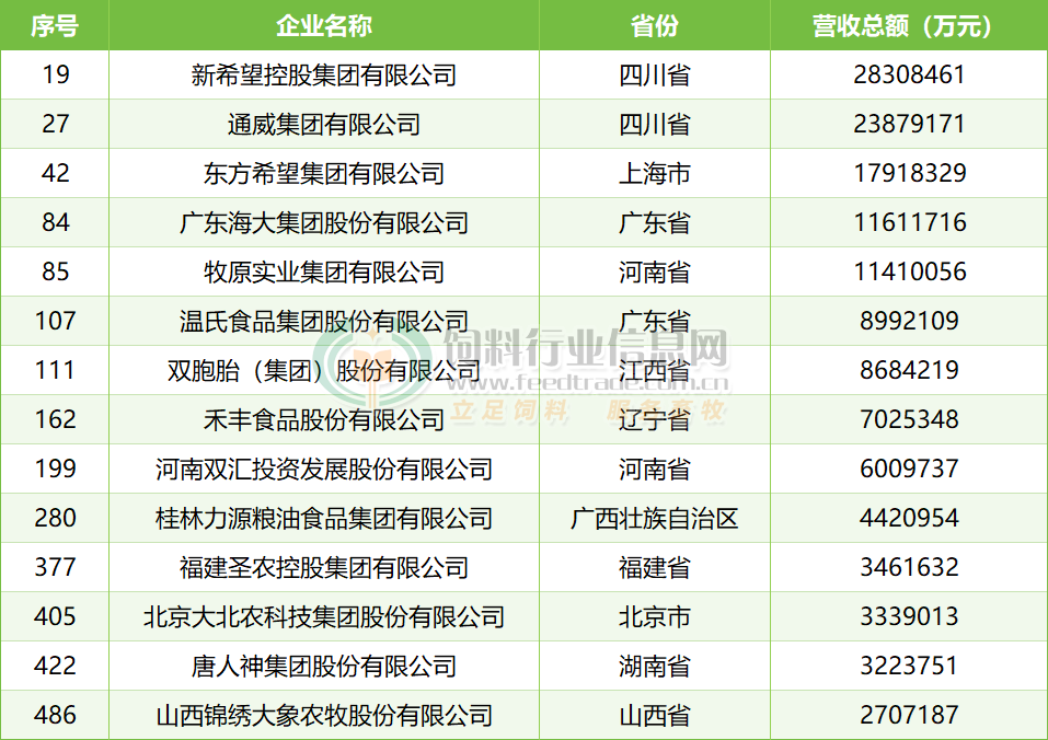 其中,新希望、通威集團、東方希望、海大集團、牧原集團、溫氏食品、雙胞胎、禾豐食品、雙匯發展、桂林力源、福建圣農、大北農、唐人神、大象農牧等14家農牧及農牧板塊業務有較大影響力的企業上榜,營收總額約1.5361萬億元。