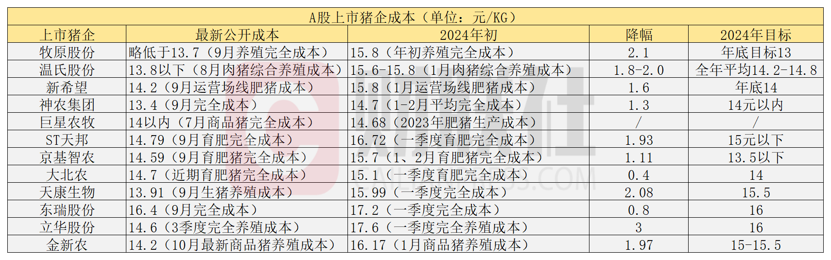 財聯社記者統計發現,A股有公開成本信息的12家上市豬企中,在不考慮成本統計方式差異化因素下,有11家豬企成本已降至每公斤14元區間,其中有5家企業成本已降入每公斤13元區間。