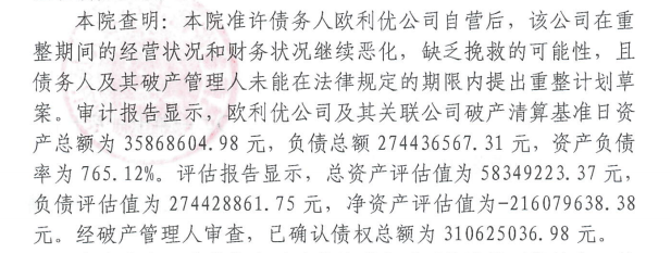 法院披露的審計報告顯示,歐利優乳業及其關聯公司截至破產清算基準日的資產總額約3586.86萬元,債務總額約2.74億元,資產負債率為765.12%。評估報告顯示,歐利優乳業及其關聯公司資產評估值約5834.92萬元,凈資產評估值約為-2.16億元。經破產管理人審查,截至2021年11月,歐利優乳業及4家關聯公司已被債權人確認債權總額約3.11億元。