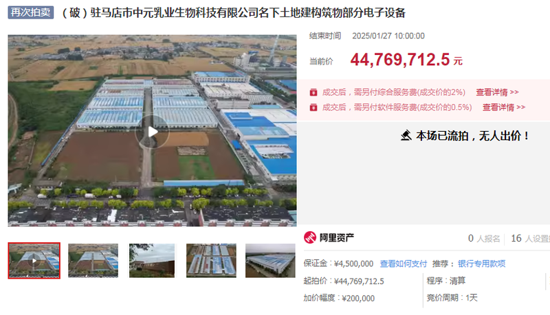 歷經多次拍賣無人問津,駐馬店市中元乳業生物科技有限公司(簡稱“中元乳業”)名下土地建筑等資產近期再次流拍。