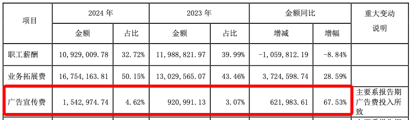 值得關注的是,2024年金字火腿廣告宣傳費大增,從2023年的92萬元增至2024年154.3萬元,一年增加約62萬元,同比飆升67.53%。公司稱,主要系報告期廣告費投入所致。