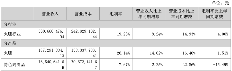 毛利率方面,年報顯示,火腿行業2024年毛利率為19.23%,較2023年下滑4.00%。