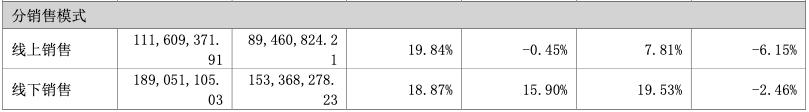 分銷售模式看,公司線上和線下銷售毛利率分別下滑6.15%、2.46%。
