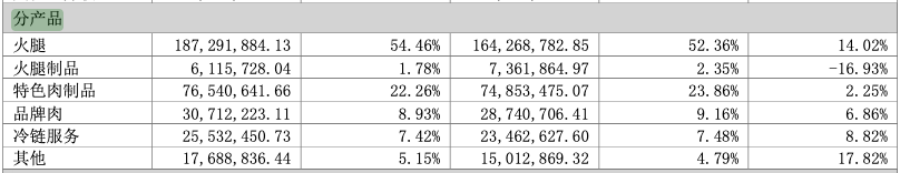 分產品看,火腿仍是公司營收重頭。2024年火腿收入同比增長14.02%,占公司營業收入比重為54.46%,較2023年有所增長。而火腿制品雖然占比僅1.78%,但收入同比下滑16.93%。