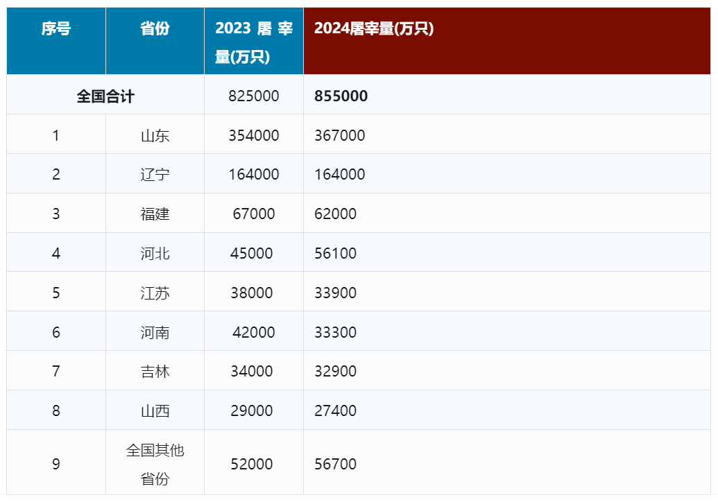 從各省份屠宰量排名情況來看,2024 年屠宰量排名前5的省份依次為山東、遼寧、福建、河北和江蘇。