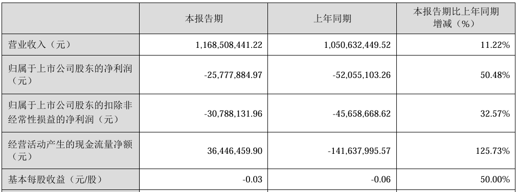 財報顯示,今年一季度,金新農實現營業總收入11.69億元,同比增長11.22%,歸母凈利潤-2577.79萬,虧損同比縮小50.48%。