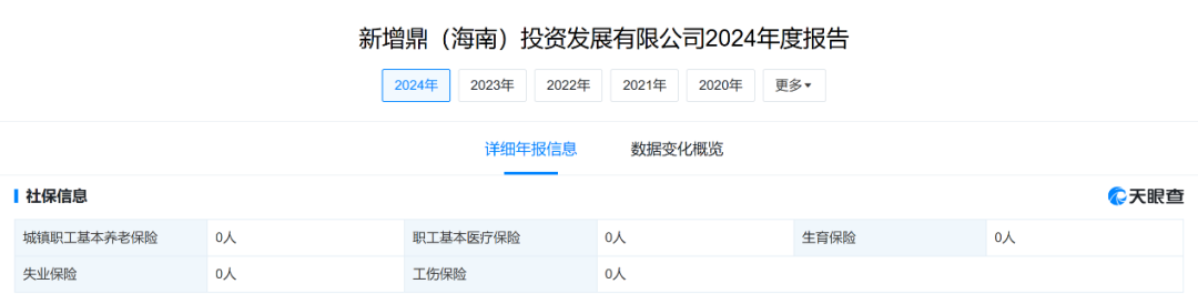 不過,天眼查顯示,2021年~2022年,新增鼎的參保人數分別為2人、7人,但2023年和2024年,新增鼎的參保人數都是0。