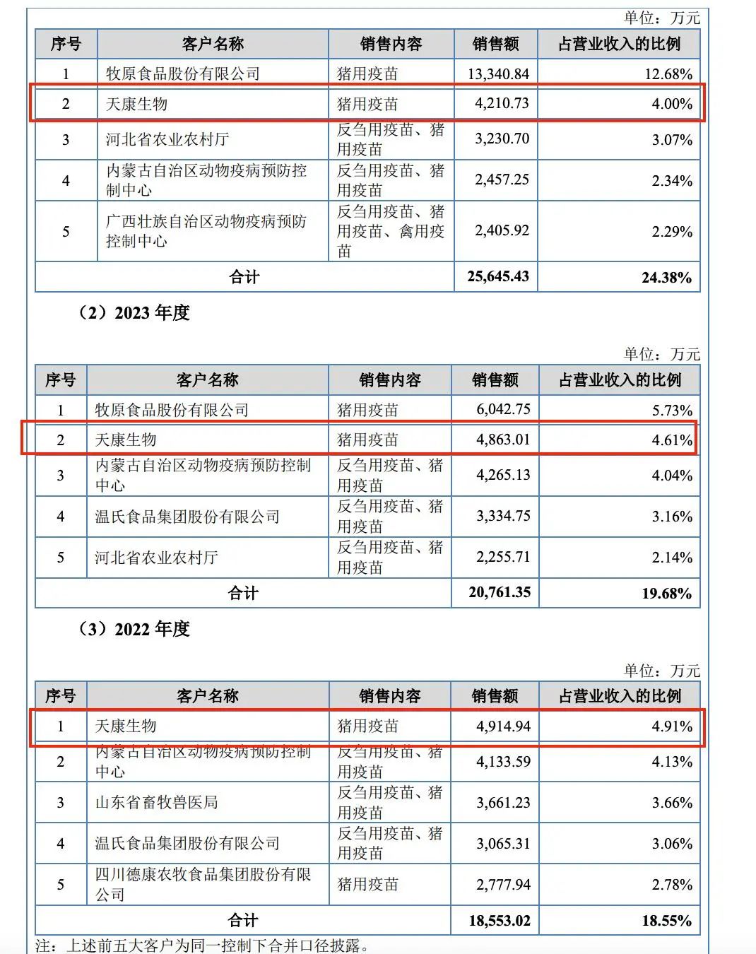 報告期內,天康制藥前五大客戶主要為政采模式下的內蒙古自治區動物疫病預防控制中心、河北省農業農村廳、廣西壯族自治區動物疫病預防控制中心、山東省畜牧獸醫局,以及直銷模式下的牧原股份、溫氏股份、德康農牧、天康生物等。