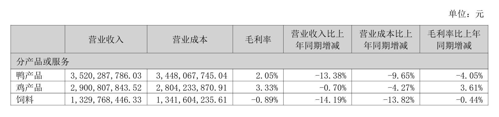 財報顯示,上半年,益客食品鴨產品、雞產品、飼料營收同比均有所下滑。其中,鴨產品毛利率同比減少4.05%至2.05%,飼料產品毛利率同比減少0.44%至-0.89%。