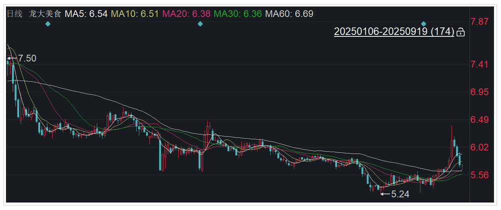 二級市場上,截至9月19日收盤,龍大美食報5.72元/股,最新市值61.73億元,今年來公司股價累計下跌近三成。