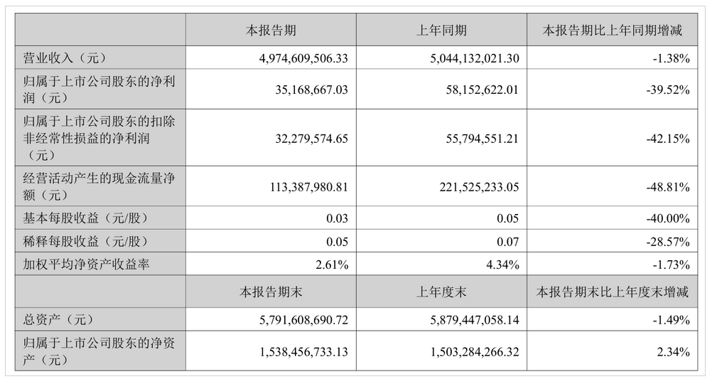 2025年上半年,公司實現營業收入49.75億元,同比減少1.38%;歸母凈利潤為3516.87萬元,同比減少39.52%;扣非凈利潤為3227.96萬元,同比減少42.15%。