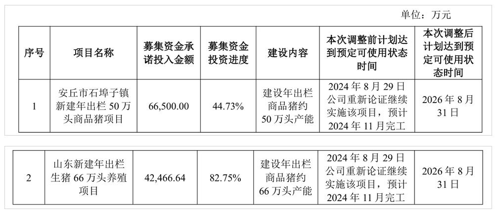同日,龍大美食還宣布,對“安丘市石埠子鎮新建年出欄50萬頭商品豬項目”和“山東新建年出欄66萬頭養殖項目”達到預計可使用狀態的日期延長至2026年8月31日,同時對這兩個項目進行重新論證。值得一提的是,這已非上述項目首次延期。