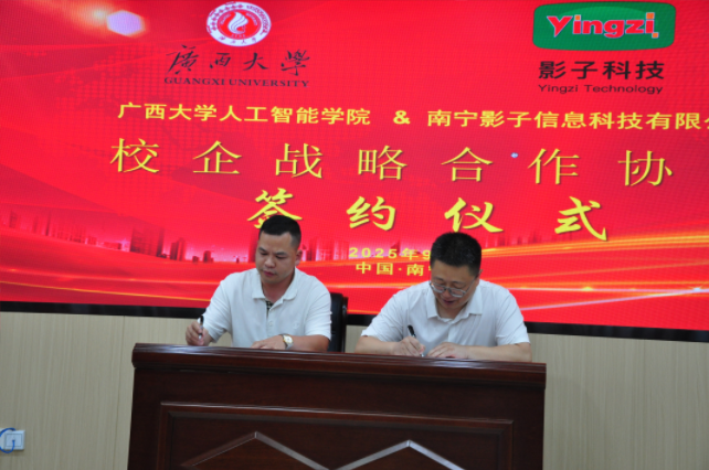 9月29日,廣西大學人工智能學院與南寧影子信息科技有限公司校企戰略合作協議簽約儀式在學院內舉行,雙方聚焦農牧產業數字化轉型需求,就推動人工智能領域人才培養與技術創新達成合作共識,開啟產教深度協作新篇章。