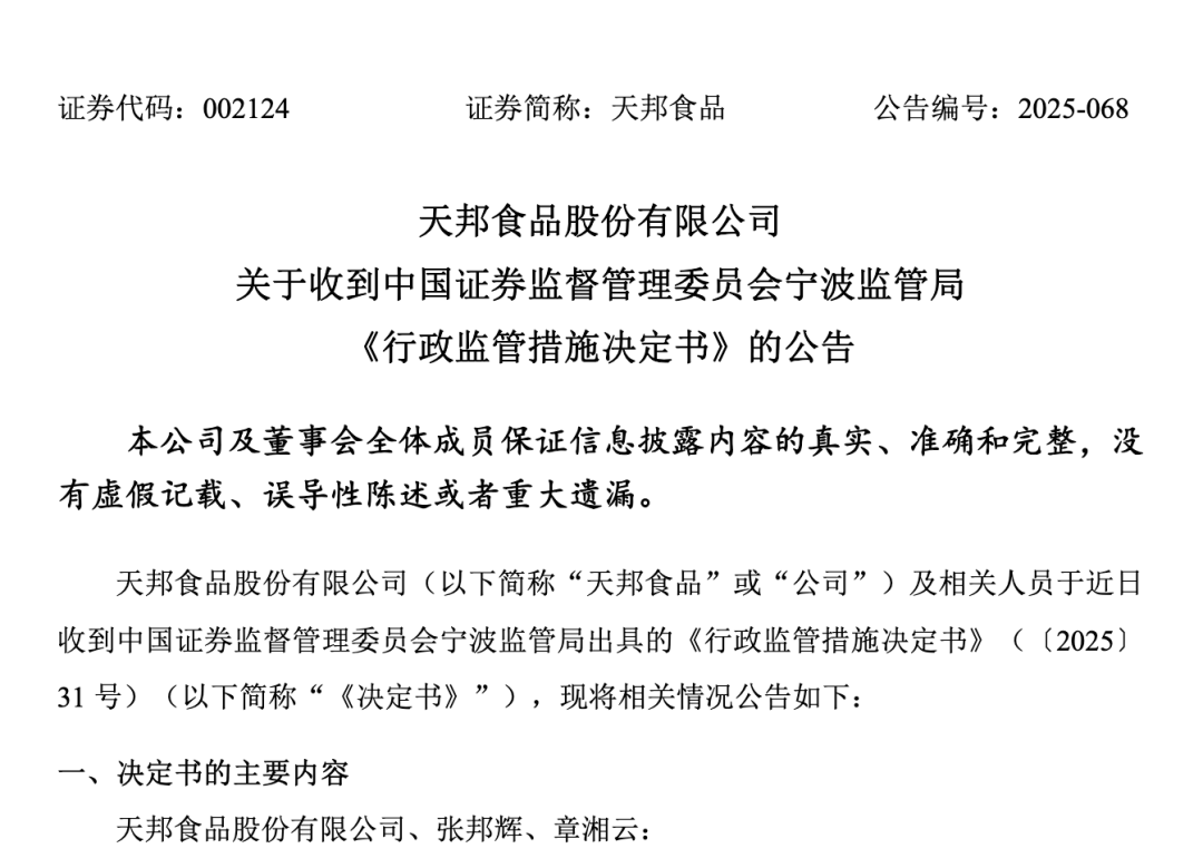 9月29日,天邦食品(002124.SZ)發布公告稱,公司及相關人員于近日收到中國證券監督管理委員會寧波監管局出具的《行政監管措施決定書》(下稱《決定書》)。