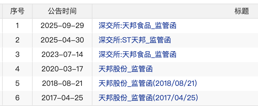 更早之前的2017年、2018年,天邦食品也曾收到監管函。盡管公司每次均表態“杜絕此類事件再次發生”,但違規問題仍反復出現。