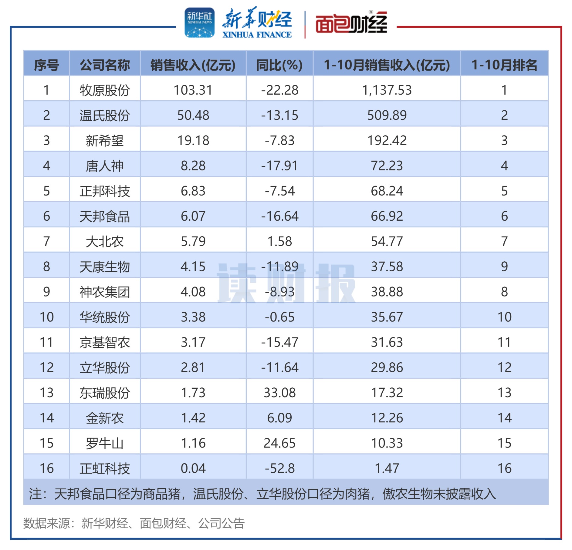 近期,生豬養殖企業10月的銷售數據陸續披露。新華財經和面包財經研究員在剔除部分數據披露不全的上市豬企后,以滬、深兩大交易所主要上市生豬養殖企業為樣本,分別統計其生豬銷售收入、銷量。