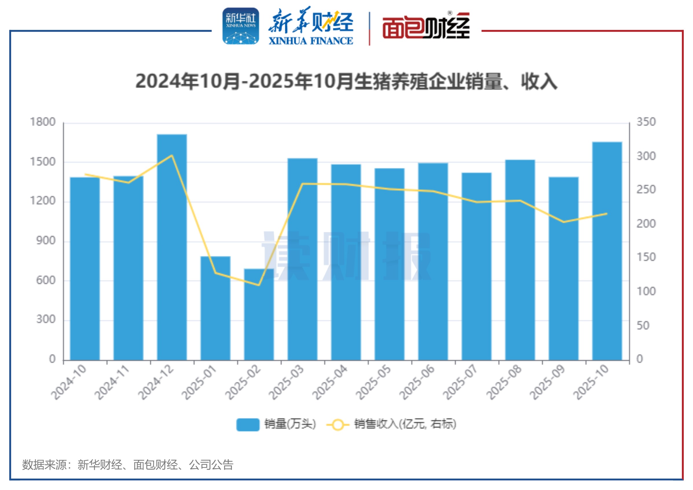 剔除部分數據缺失企業后,2025年10月,17家生豬養殖企業合計實現生豬銷量1719.92萬頭,環比上升22.42%,同比上升24.03%。同期,生豬養殖企業合計實現銷售收入為221.88億元,環比上升8.92%,同比下降19.04%。