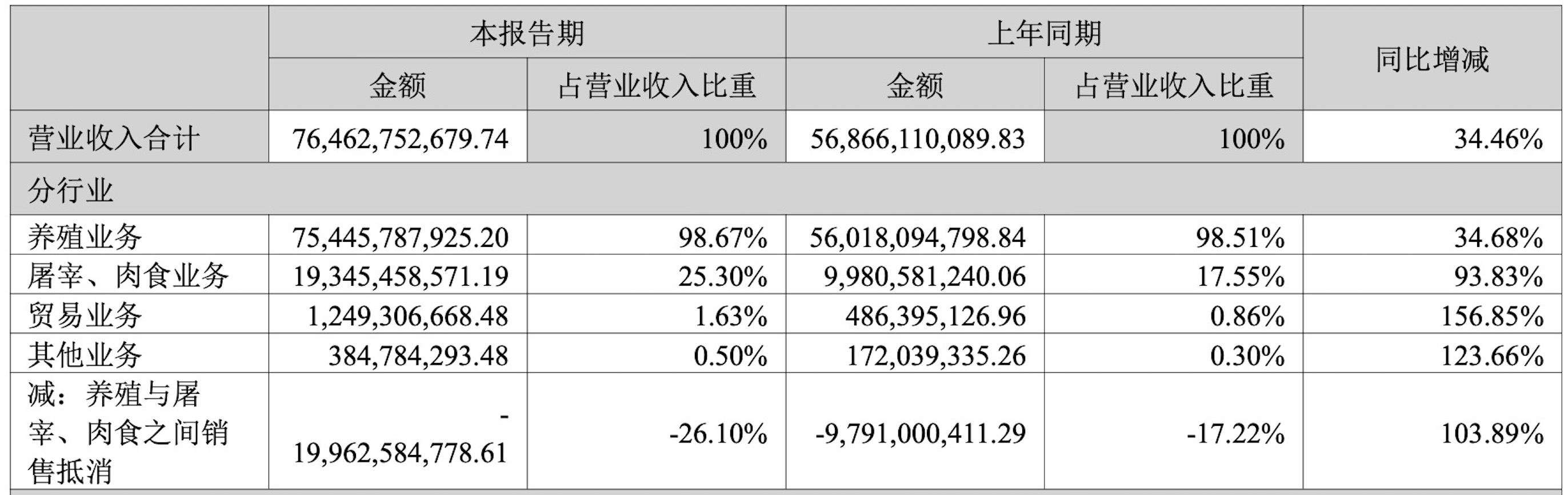 中報數據顯示,今年上半年,公司的屠宰、生肉業務營收占總營收的25.3%,同比增長93.83%,這一業務板塊正在成為公司收入結構中的重要組成部分。