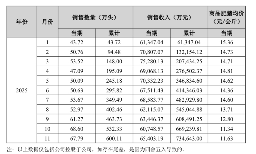 2025年1-11月,公司累計銷售商品豬600萬頭(其中仔豬銷售216萬頭),銷售收入73.46億元,銷售均價14.95元/公斤。同比來看,銷售數量增長10.13%,銷售收入下降7.65%,銷售均價下降16.70%。