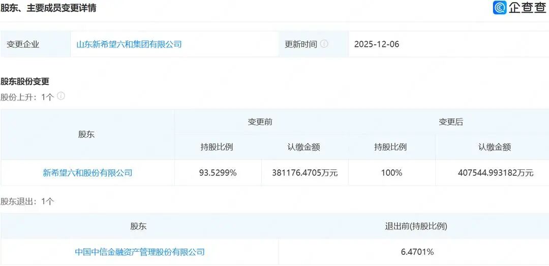 其中,中國中信金融資產管理股份有限公司(下稱“中信金融資產”)退出山東六和,其退出前在山東六和的認繳出資為2.64億元,持股比例為6.47%。新希望(000876.SZ)接手中信金融資產所持山東六和所有股份。目前,新希望對山東六和的認繳出資額為40.75億元,持股比例為100%。