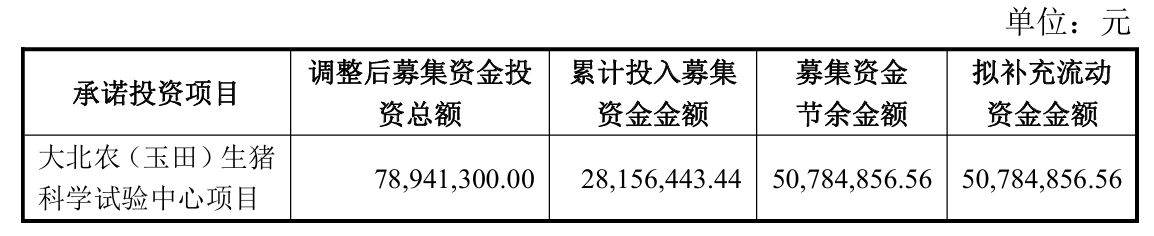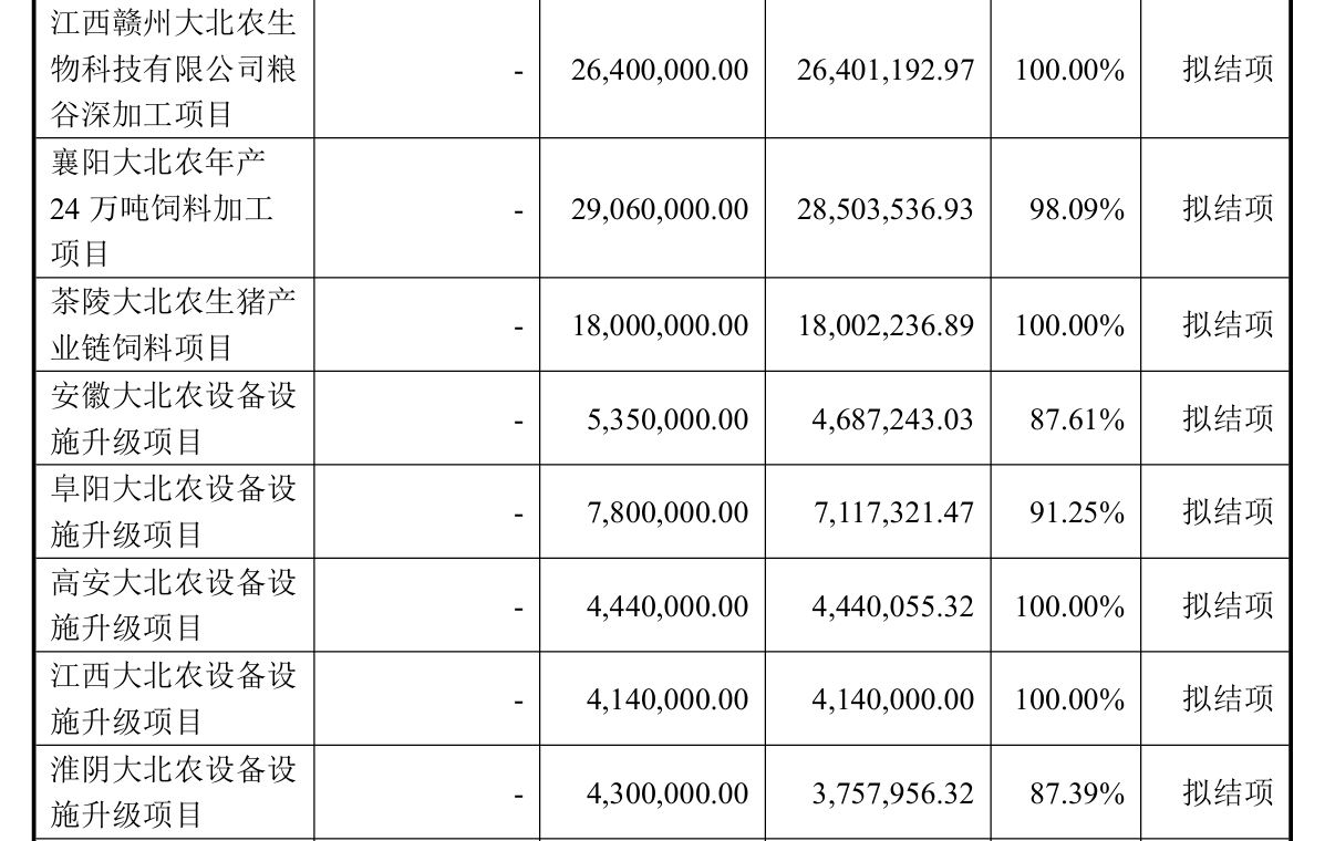 其中,公司擬終止的募投項目為“大北農(玉田)生豬科學試驗中心項目”,截至2025年12 月31日已累計投入2815.64萬元,投入進度為35.67%。