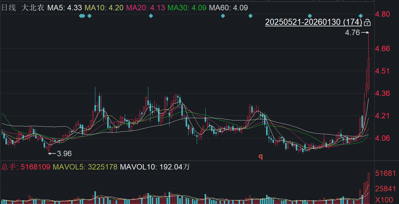 二級市場上,截至1月30日收盤,大北農上漲3.85%報4.59元/股,總市值約197.37億元,近一月來公司股價累計上漲約15%。