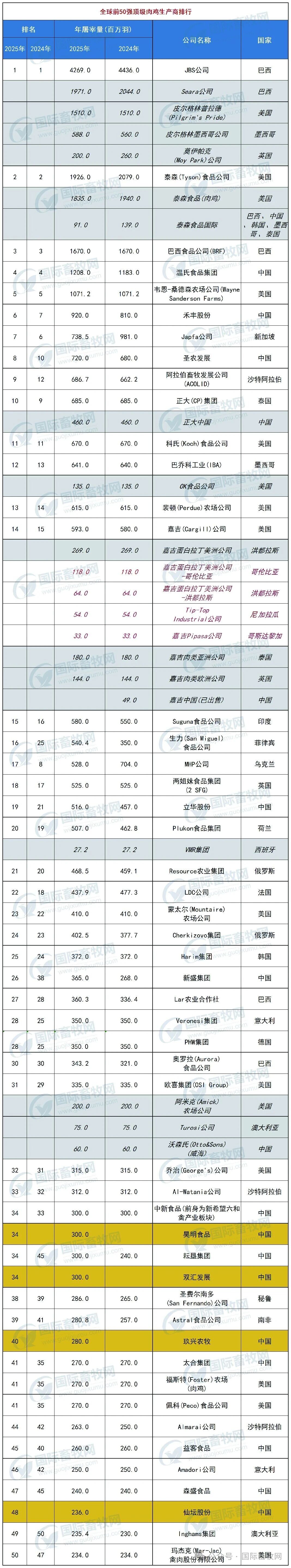 2025年全球頂級肉雞企業 50 強公布:中國溫氏、禾豐、圣農、正大、立華、昊明等上榜