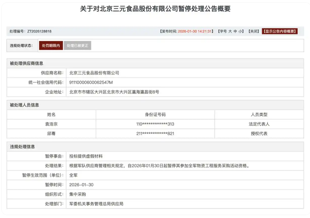 日前,軍隊采購網顯示,知名乳企三元股份因“投標提供虛假材料”而被處以暫停參加全軍物資工程服務采購活動資格。根據軍隊供應商管理相關規定,自2026年1月30日起暫停三元股份參加全軍物資工程服務采購活動資格。