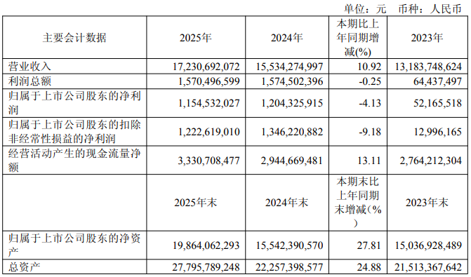 全球動物營養品行業龍頭之一安迪蘇(600299)3月6日晚間發布2025年年報,2025年全年公司實現營業收入172.31億元,同比增長10.92%;歸母凈利潤11.55億元,同比減少4.13%;扣非凈利潤12.23億元,同比減少9.18%。