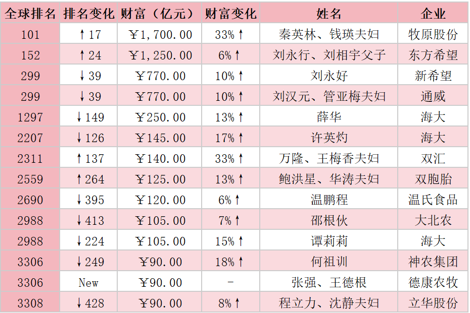 此次上榜的農牧企業家中,僅有秦英林、錢瑛夫婦和雙匯萬隆、王梅香夫婦實現排名上升,萬隆、王梅香夫婦財富140億元,漲幅33%,全球排名上升137位至2311名。其余超8成企業家排名出現下滑,其中立華股份程立力、沈靜夫婦排名下滑幅度最大,從去年2880名跌至3308名。不過排名下滑并未影響財富增長,東方希望劉永行、劉相宇父子以1250億元財富緊隨秦英林夫婦之后,新希望劉永好與通威劉漢元、管亞梅夫婦則均以770億元財富并列全球299位。