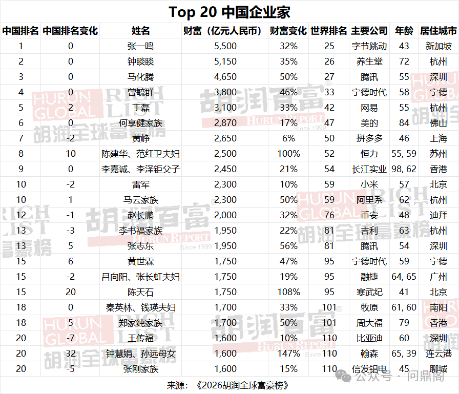 3月5日,胡潤研究院發布的《2026胡潤全球富豪榜》顯示,全球十億美金企業家數量首次突破4000人大關,達到4020位,較去年增加578位,總財富增長28%。其中,中國以1110位十億美金企業家超越美國的1000位,重新成為全球第一,新增287位,貢獻了全球近半數新面孔,字節跳動創始人張一鳴繼續蟬聯中國首富。
