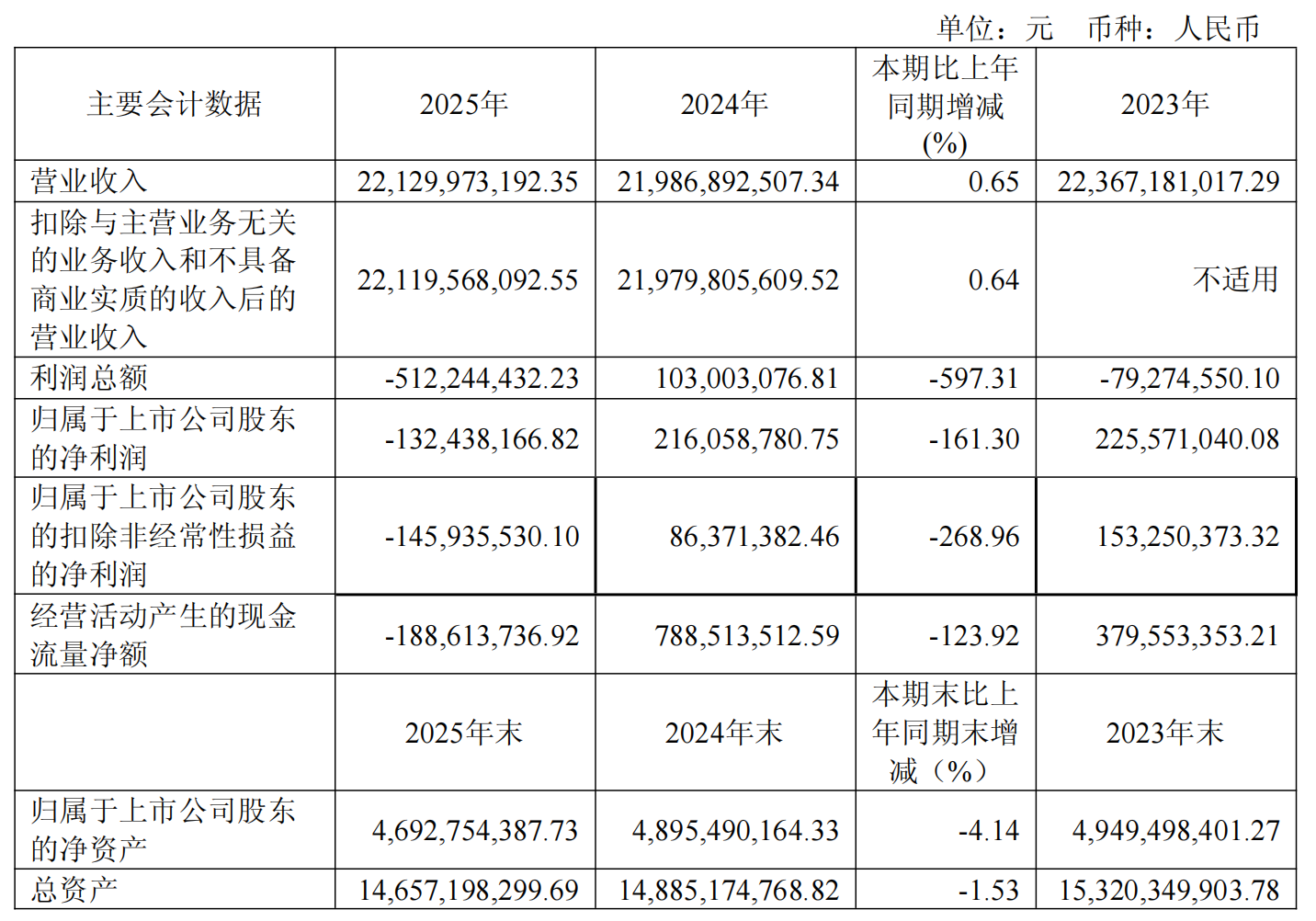 3月30日,光明肉業(600073)披露年報,2025年,公司實現營業收入221.30億元,比上年度219.87億元同比增加1.43億元,增幅0.65%;歸母凈利潤-1.32億元,比上年度2.16億元減少3.48億元,降幅161.30%;扣非凈利潤-1.46億元,比上年度8637.14萬元減少2.32億元,降幅268.96%;實現每股基本收益-0.14元/股,較上年度0.23元/股減少0.37元/股。