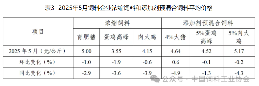 2025年5月,全國工業飼料產量2770萬噸,環比增長0.6%,同比增長6.9%。其中,配合飼料、添加劑預混合飼料同比分別增長7.3%、8.1%,濃縮飼料同比下降5.6%。飼料產品出廠價格同比明顯下降,配合飼料、濃縮飼料、添加劑預混合飼料出廠價格環比以降為主。飼料企業生產的配合飼料中玉米用量占比為39.4%,同比增長3.1個百分點;配合飼料和濃縮飼料中豆粕用量占比為12.1%,同比下降1.7個百分點。