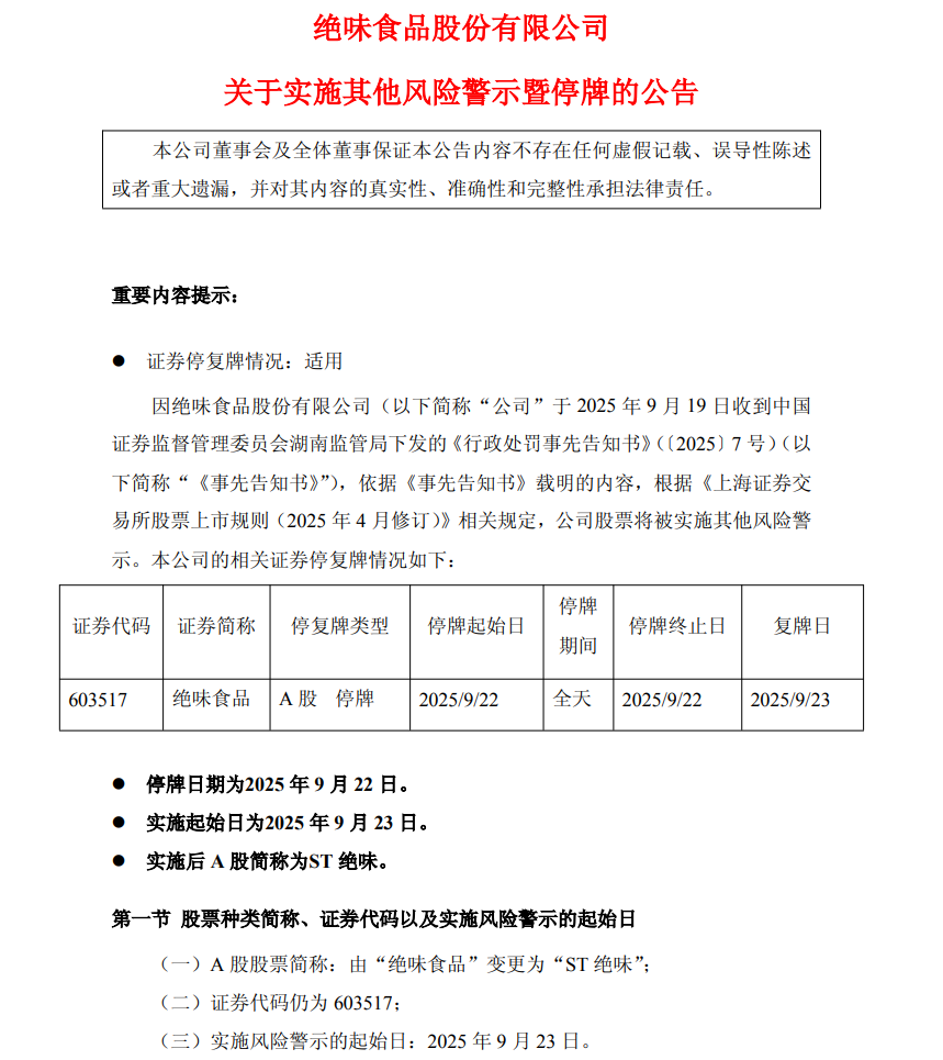 絕味食品公告稱,公司A股股票簡稱由“絕味食品”變更為“ST 絕味”; 證券代碼仍為603517;實施風險警示的起始日為2025年9月23日。
