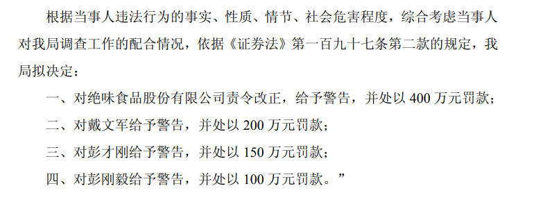 中國證監會湖南監管局認為,絕味食品上述行為涉嫌違反《證券法》等相關法律規定。為此,該局決定對絕味食品責令改正,給予警告,并處以400萬元罰款;對時任董事長兼總經理戴文軍給予警告,并處以200萬元罰款;對時任財務總監彭才剛給予警告,并處以150萬元罰款;對時任董事會秘書彭剛毅給予警告,并處以100萬元罰款。此次處罰共計850萬元。
