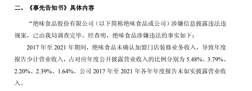《告知書》顯示,2017年至2021年期間,絕味食品未確認加盟門店裝修業務收入,導致年度報告少計營業收入,占對應年度公開披露營業收入的比例分別為5.48%、3.79%、2.20%、2.39%、1.64%。公司2017年至2021年各年年度報告未如實披露營業收入。
