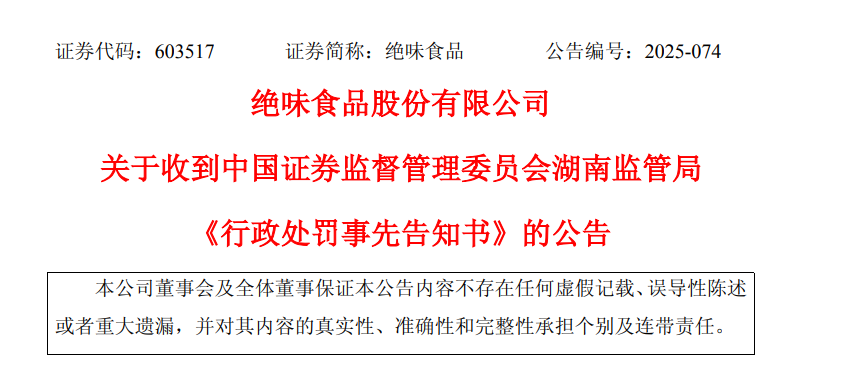 絕味食品股份有限公司關于收到中國證券監督管理委員會湖南監管局《行政處罰事先告知書》的公告截圖